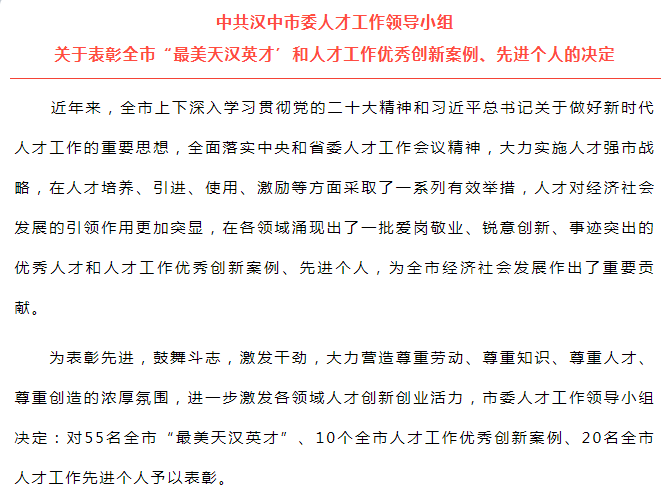 此次評選根據《中共漢中市委組織部關于開展全市“最美天漢英才”和人才工作優秀創新案例、先進個人評選工作的通知》精神,經逐級遴選和嚴格審核把關。